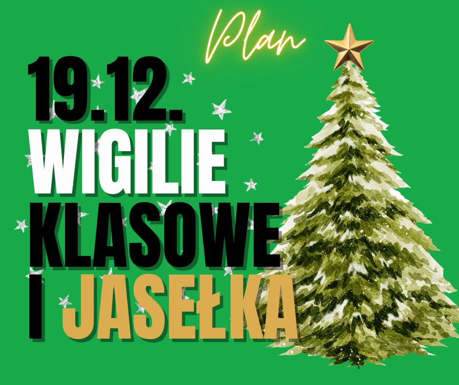 Wszyscy uczniowie przychodzą na 9:00 aby przygotować wigilie klasowe i spędzić wspólnie przedświąteczny czas. Szczegółowy plan dnia przekażą wychowawcy.
