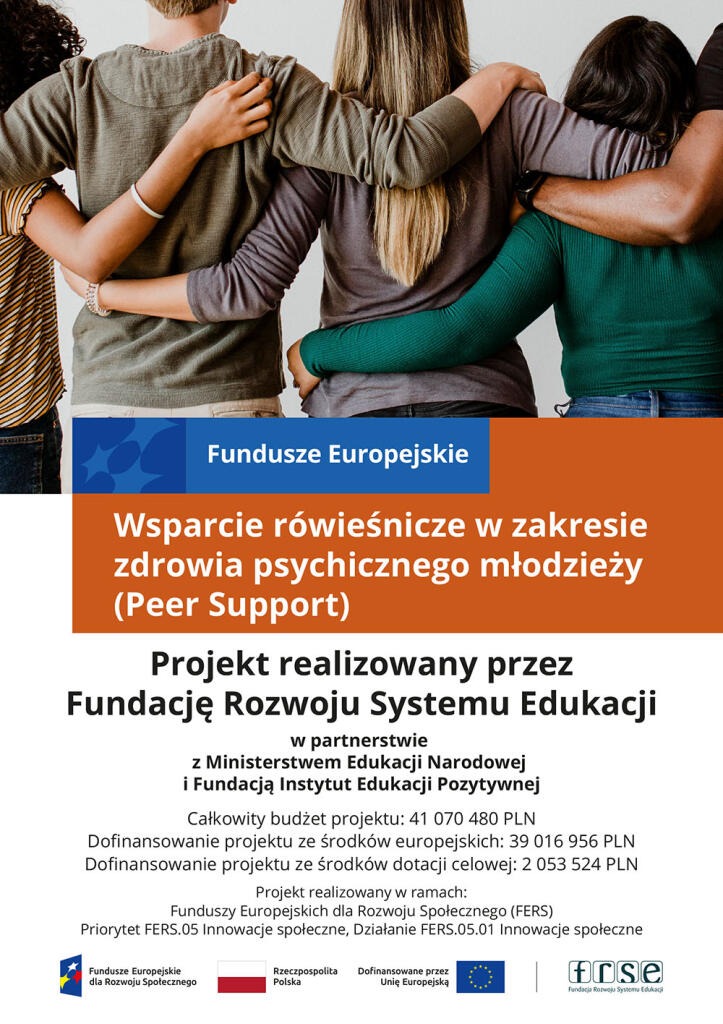 Projekt jest realizowany w ramach projektu „Wsparcie rówieśnicze w zakresie zdrowia psychicznego młodzieży (Peer Support)”, prowadzonego przez Fundację Rozwoju Systemu Edukacji w ramach programu Fundusze Europejskie dla Rozwoju Społecznego 2021–2027 w Partnerstwie z Ministerstwem Edukacji Narodowej i Fundacją „Instytut Edukacji Pozytywnej”.